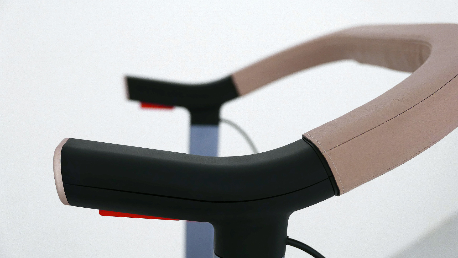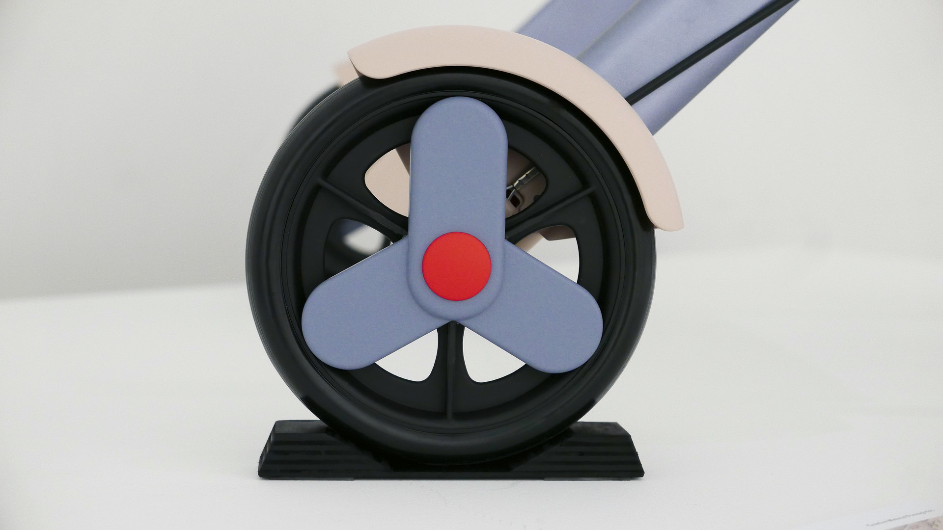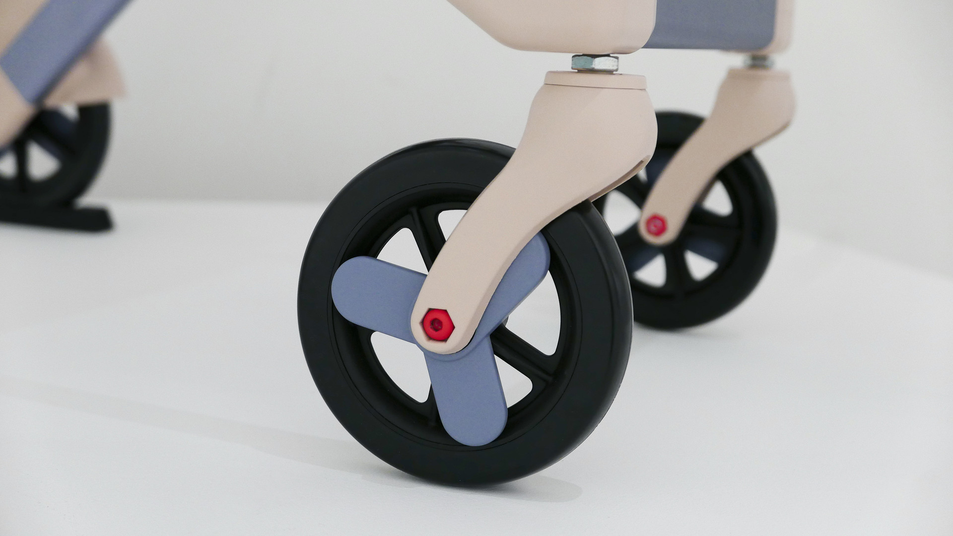 The wheels are finished with rounded covers that add a soft, premium accent, while a red highlight at the center of the rotation axis acts as a clear focal point. Together, these details create a balanced CMF composition where material warmth and precise color cues reinforce both identity and usability.