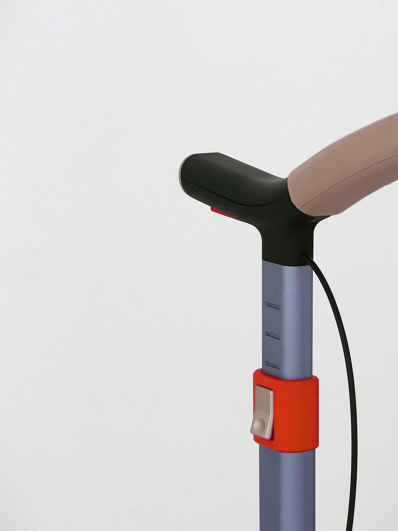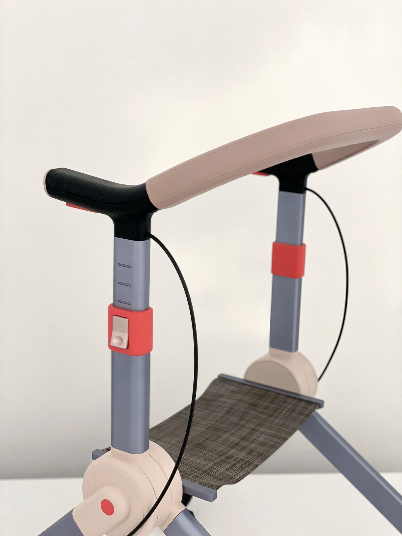 These close-up views highlight the handle’s left–right details, designed to make key controls instantly readable and easy to use. The height-adjustment button and brake control are deliberately placed within the natural hand zone and emphasized with a high-visibility red accent, reducing hesitation and preventing operating mistakes. Soft-touch materials and a clean, continuous form guide the user’s grip while keeping the interface intuitive prioritizing comfort, safety, and confidence in everyday walking.