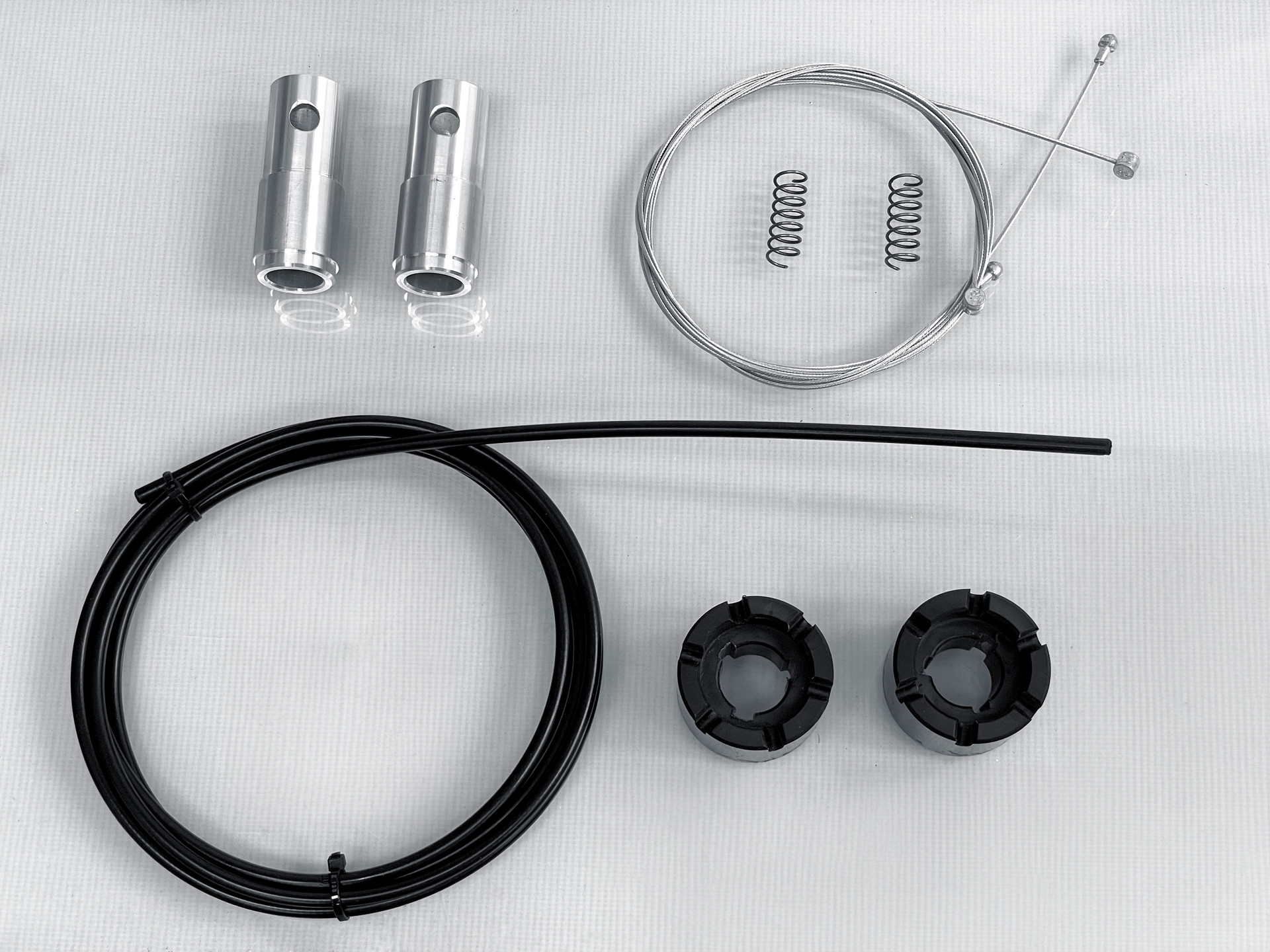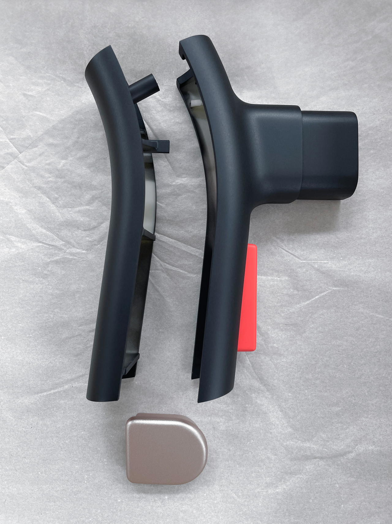 These prototype parts represent the production-ready component set of the walker, refined for scalable manufacturing while preserving the original CMF intent. The system is built around standardized aluminum tube interfaces and machined joint inserts, paired with injection-molded housings that form the handle and control areas. High-contrast red modules such as the oversized height-adjust button are designed as clear, tactile points of interaction, supporting universal usability at a glance. Functional elements (brake/actuation cables, springs, and locking collars) are organized as serviceable sub-assemblies, enabling cleaner assembly, maintenance, and consistent quality, while the calm blue/neutral base palette is anchored by precise red accents for balanced visual hierarchy.