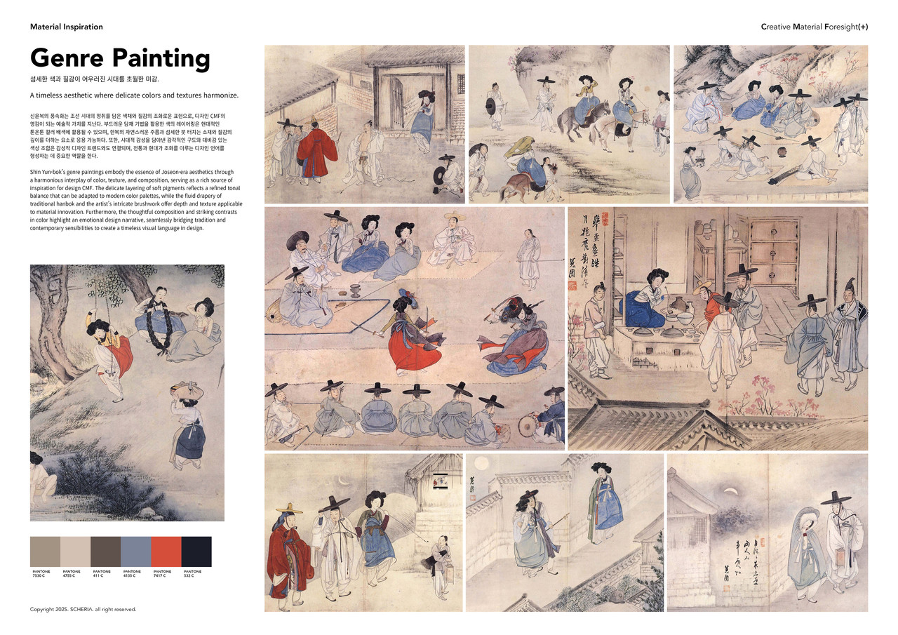 This color concept board draws inspiration from Shin Yun-bok’s Joseon-era genre paintings, translating their refined tonal balance into a contemporary CMF direction. Soft, dusted neutrals and cool blue-grays form a calm base, while restrained, high-contrast accents especially the signature reds seen in traditional garments add rhythm and visual focus. By extracting the paintings’ subtle layering, warm-cool harmony, and elegant restraint, the palette becomes a bridge between heritage and modern taste, providing a clear concept for applying “Korean-ness” in a premium, trend-aware design language.