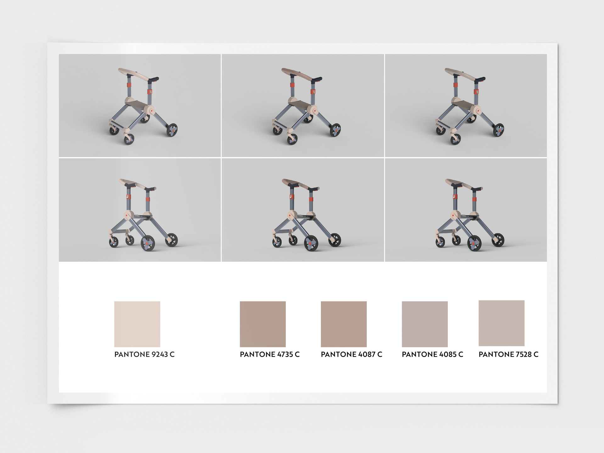 This CMF color board translates the Shin Yun-bok–inspired color concept into a production-ready palette by extracting key PANTONE tones and applying them directly to the mass-manufacturable walker. The original color ratios and accent logic are preserved balancing calm, traditional hues with a clear red highlight for functional touchpoints so the final design maintains cultural authenticity while presenting a refined, contemporary presence for exhibition and commercialization.