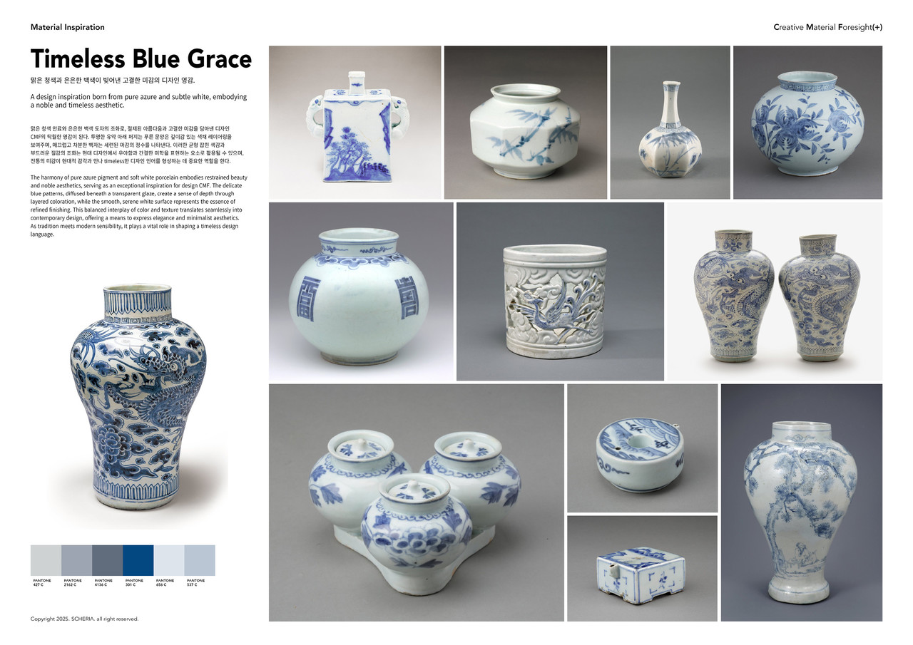 This color concept board draws inspiration from Joseon-era blue-and-white porcelain (Cheonghwa Baekja), translating its quiet elegance into a contemporary design language. The restrained contrast between milky white porcelain and cobalt blue motifs becomes a modern CMF framework built on clean negative space, soft tonal transitions, and a single, decisive accent hue. Rather than reproducing patterns literally, the board extracts the essence of Cheonghwa: clarity, balance, and timeless calm so traditional sensibility can live naturally within today’s minimal, premium aesthetic.