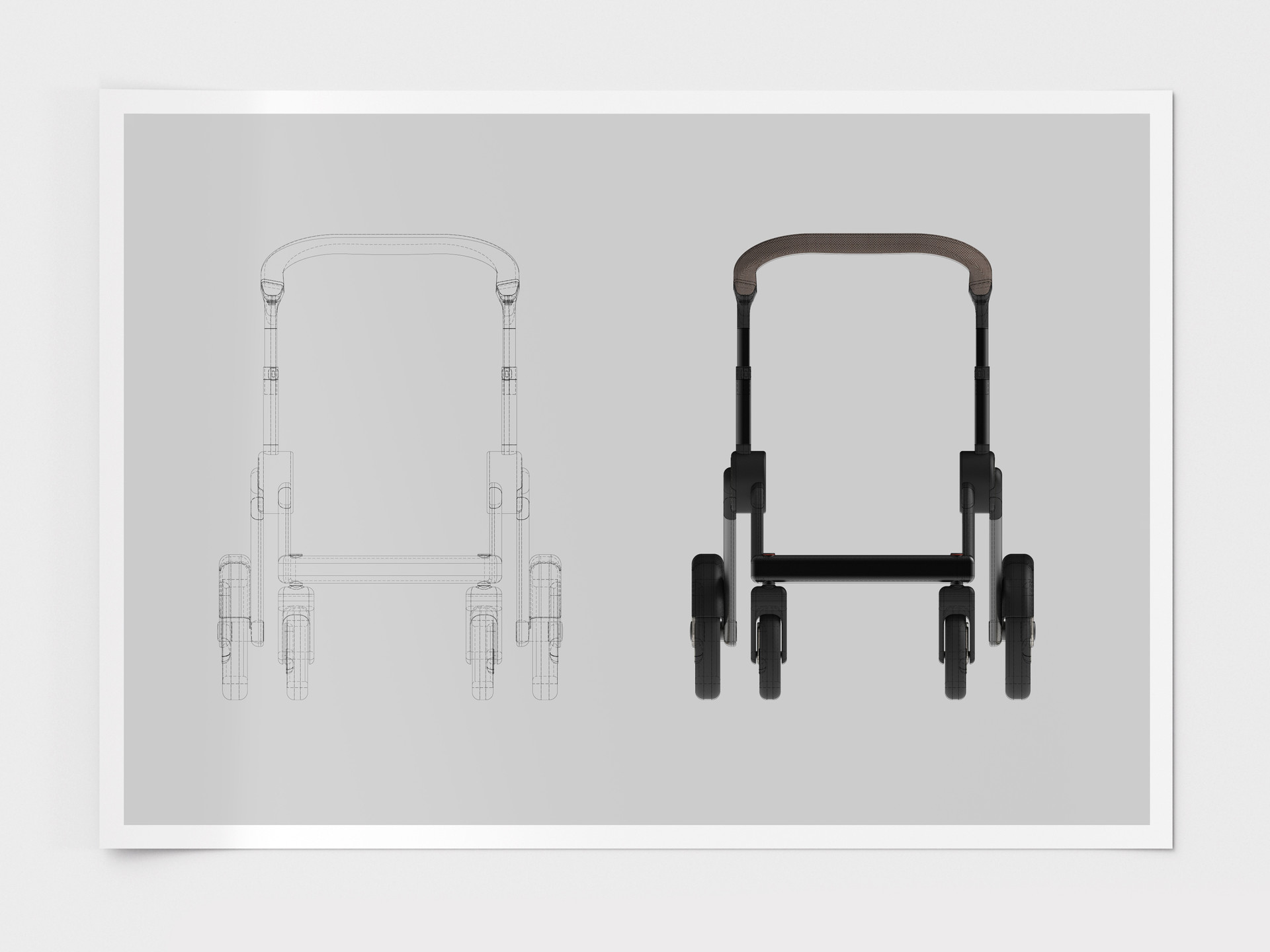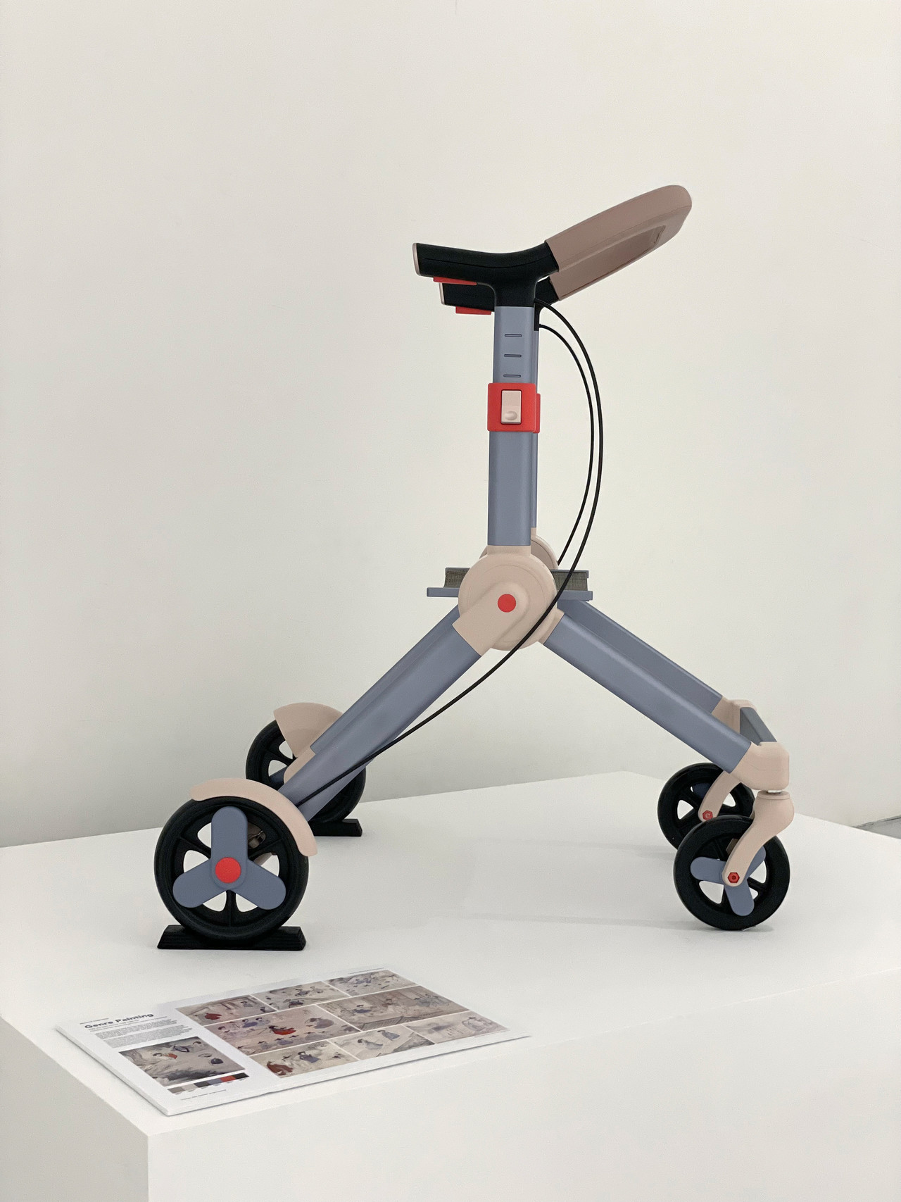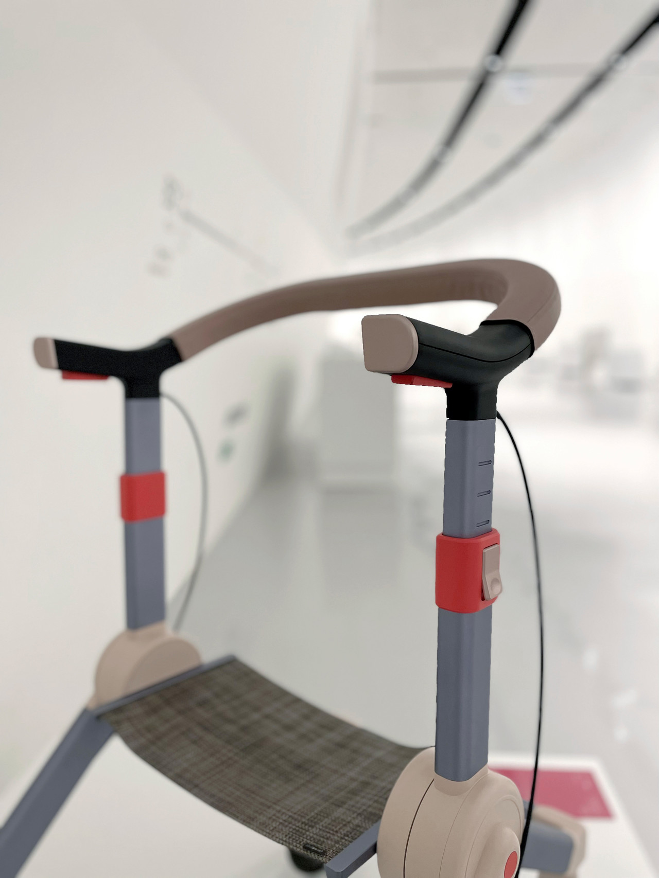 To prepare the walker for mass production, the overall engineering was refined with a focus on manufacturability and weight efficiency. The aluminum frame sections were standardized in thickness to simplify tooling and optimize mold design, while the wheel sizes were recalibrated to balance stability with a lighter overall build. This updated architecture was implemented directly into the exhibition prototype, allowing the final display piece to represent the same production-ready specification intended for future manufacturing.