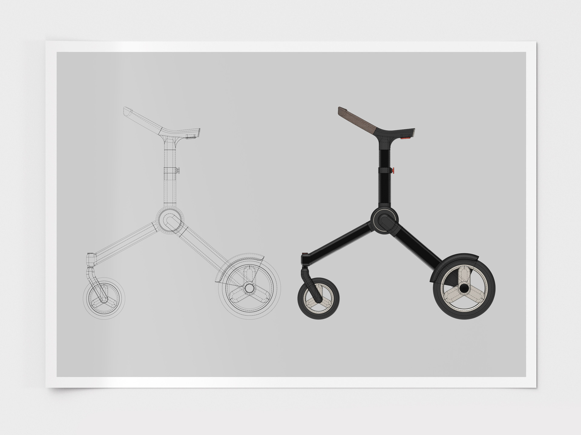 This concept visualization blends illustration-style linework with 3D modeling to bridge the gap between sketch and product. The transparent “wire” view reveals the underlying structure and proportions, while the rendered version applies refined surfaces, CMF, and functional detailing showing how the initial idea evolves into a resolved design. By layering technical clarity with realistic form and color, the image communicates both engineering intent and the final visual identity in a single frame.