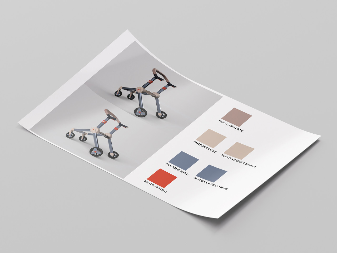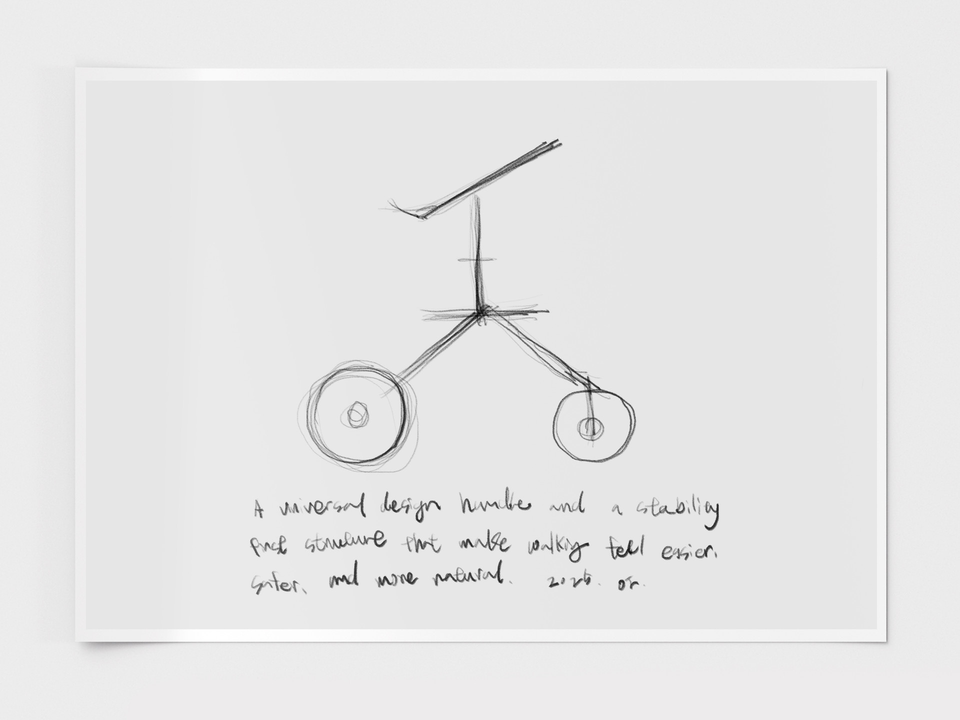 This early concept sketch captures the first moment the walker’s identity took shape reduced to a simple silhouette and a few decisive lines. Alongside the drawing, handwritten notes record the core intentions behind the design: a clear product character, intuitive handling, and a stable structure that supports natural movement. It’s a snapshot of the project’s foundation, where form and usability were defined together before details, options, and CMF were refined.