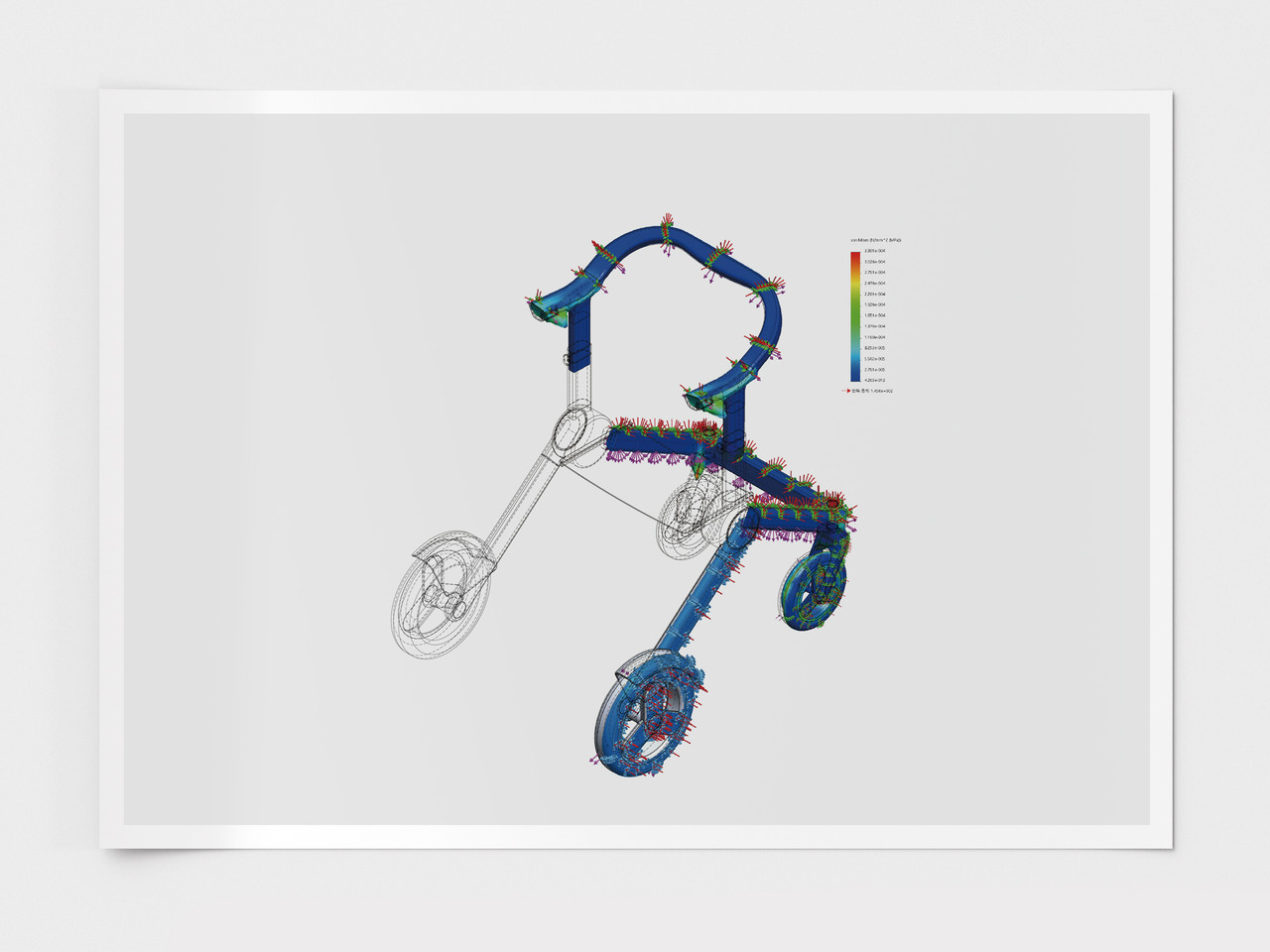 To validate safety from the earliest engineering stage, the walking-aid model was tested through structural simulation under realistic load and external pressure scenarios. Finite element analysis was used to visualize stress concentration and deformation across key parts such as the handle, joint areas, frame arms, and wheel interfaces so weak points could be identified before prototyping.