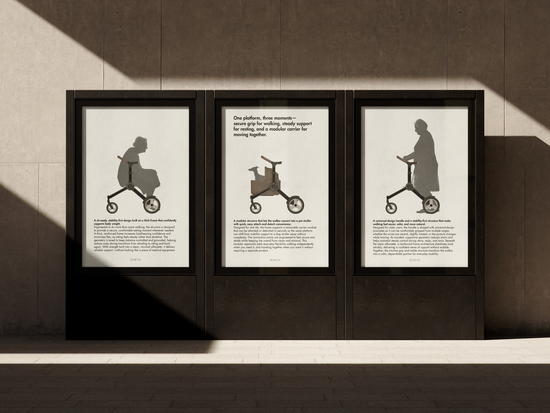 This citylight concept uses the senior walker as the brand’s main icon, expressing the brand direction through a minimal, public-facing visual. Clean silhouettes, restrained typography, and a calm palette highlight stability and universal-design usability, positioning the product as a dignified daily companion not just a mobility aid.
